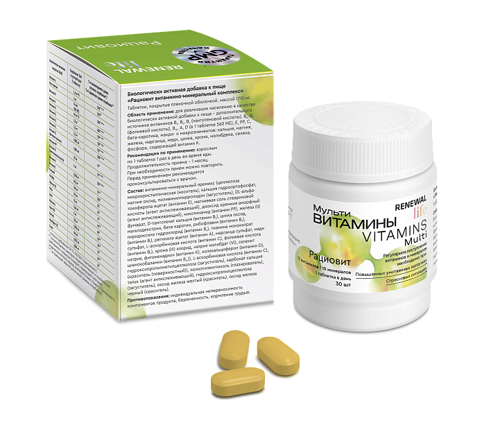 Рациовит - комплекс витаминов и минералов, соответствующий физиологической потребности организма. Применение комплекса служит для предупреждения и профилактики недостаточности витаминов и минеральных веществ.